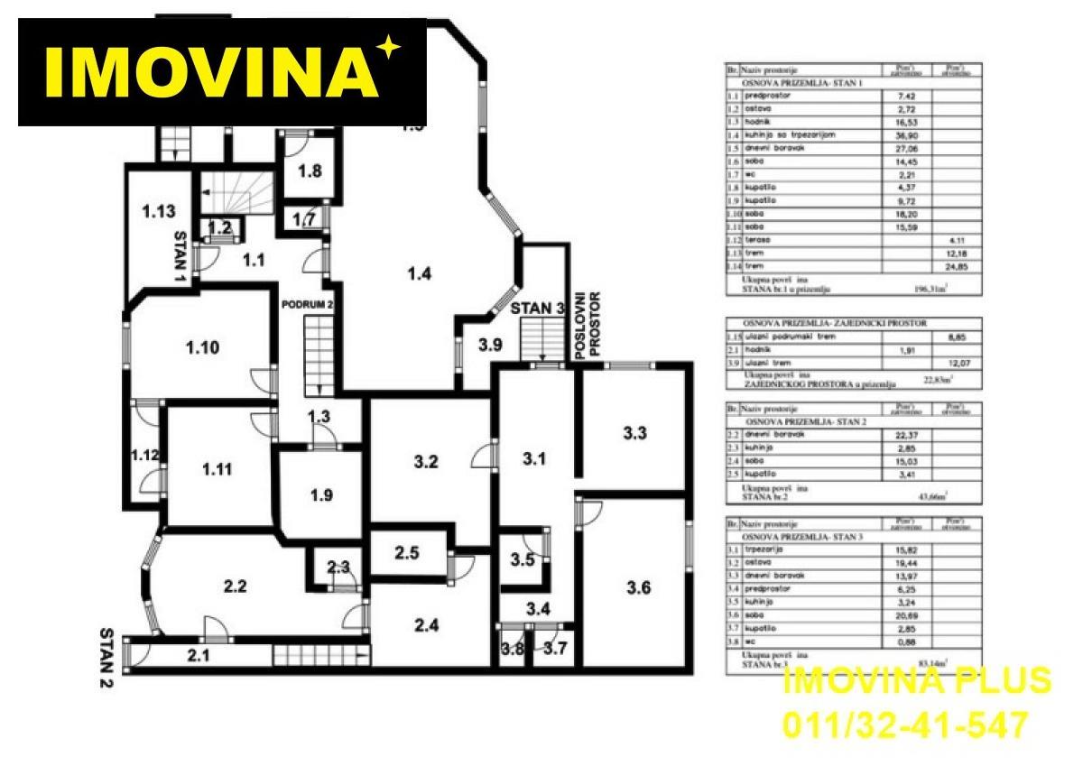 | Novi Beograd, Ledine - Veziljska kuća, 730m2 (tri terase po 4m2), plac 12a, PO+PR+I, toplotne pumpe, interfon, podrum, parking, struja, voda, kanalizacija, asfalt. Stambeno-poslovni objekat na placu od 12 ari – idealan za razne delatnosti Na prodaju ozakonjena kuća iz 2005. godine, smeštena na prostranom placu od 12 ari, sa velikim dvorištem i prilazom pogodnim za teretna vozila. Objekat je izuzetno funkcionalan i prilagodljiv različitim namenama – kako stambenim, tako i poslovnim. Na raspolaganju je 10 parking mesta. Uknjižena. Kontakt telefon: 065/32-36-409 Agencijska provizija je 2% i uključuje: - pokazivanje nekretnine i informacije vezane za mikrolokaciju - pravnu sigurnost uz tim advokata pri izradi Predugovora i Ugovora, overu kod Javnog beležnika (troškove overe kod notara plaća kupac) - odjavu prodavca - prijavu kupca (porez na prenos apsolutnih prava i porez na imovinu, infostan, struja, telefon, kablovska) R-ID: #3445 Interfon, | |