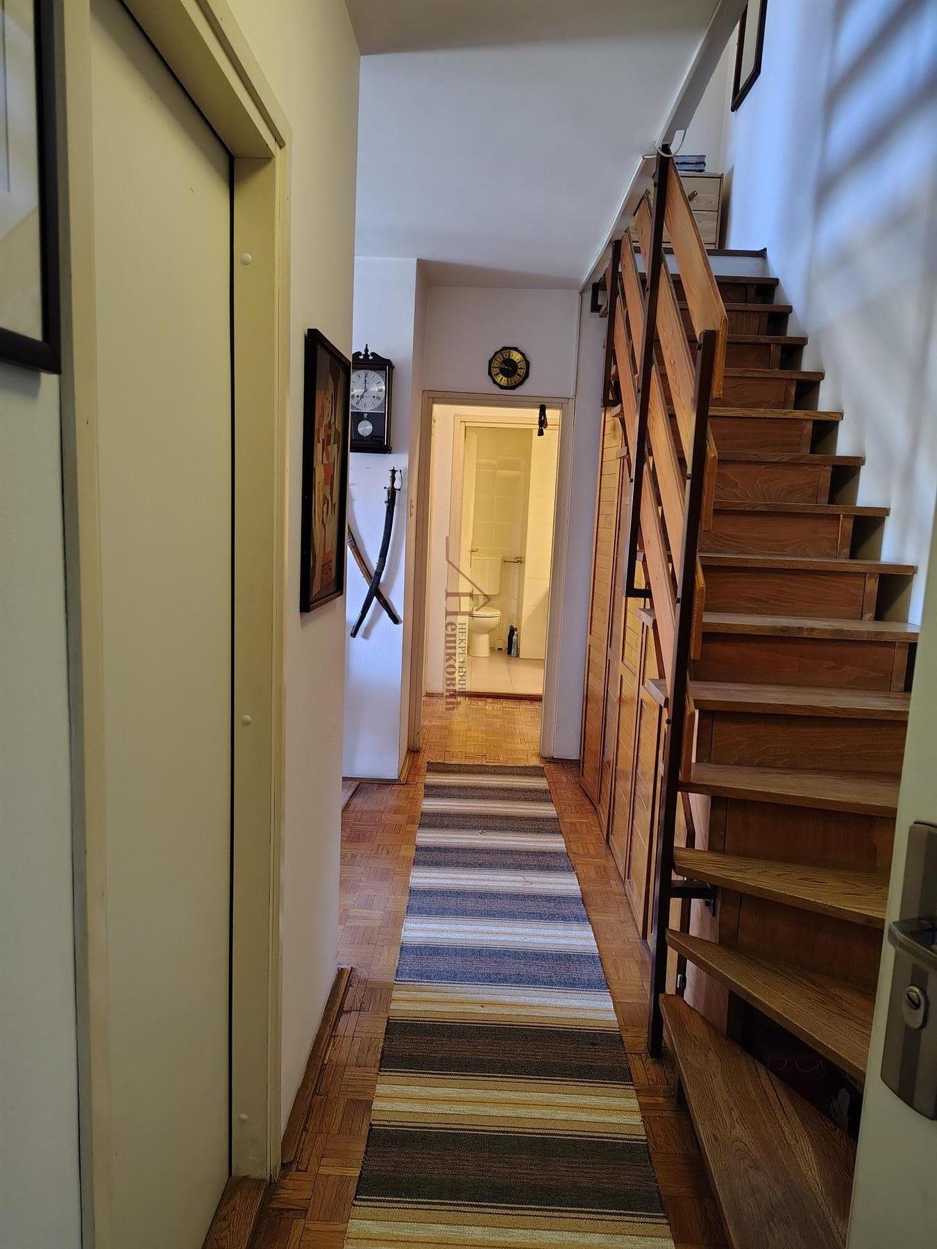 | Troiposoban stan u dva nivoa (dupleks) severoistočne orjentacije sa pogledom na park između zgrada Uknjižen bez tereta ( podoban za stambeno kreditiranje) Prostorije : Ulazni hodnik ; kuhinja odvojena trpezarija; dnevni boravak sa francuskim balkonom ; kupatilo sa WC šoljom; lođa Ostava ispod stepeništa Gornji nivo do koga se dolazi drvenim stepeništem; hodnik koji povezuje sve tri sobe DVE veće i JEDNA manja ; na svim sobama su krovni PVC prozori ; kupatilo sa WC šoljom Komforan stan za višečlanu porodicu u dobro održavanim stanju. Oba kupatila su relativno skoro renovirana Ulaz u zgradu sa dvorišne strane prema parku i na pristojnoj udaljenosti od ulice gde se kreću automobili Veliki Parking pored zgrade (nije zona) U neposrednoj blizini Osnovna škola, javni prevoz dosta manjih prodavnica, na udaljenu oko 400 metara veliko TC Bežanijska kosa Dobar pristup moto putu kao i svim delovima grada Useljiv po isplati -razgledanje po najavi Agencija je ekskluzivni posrednik Agencijska nadoknada prema opštim uslovima poslovanja | |