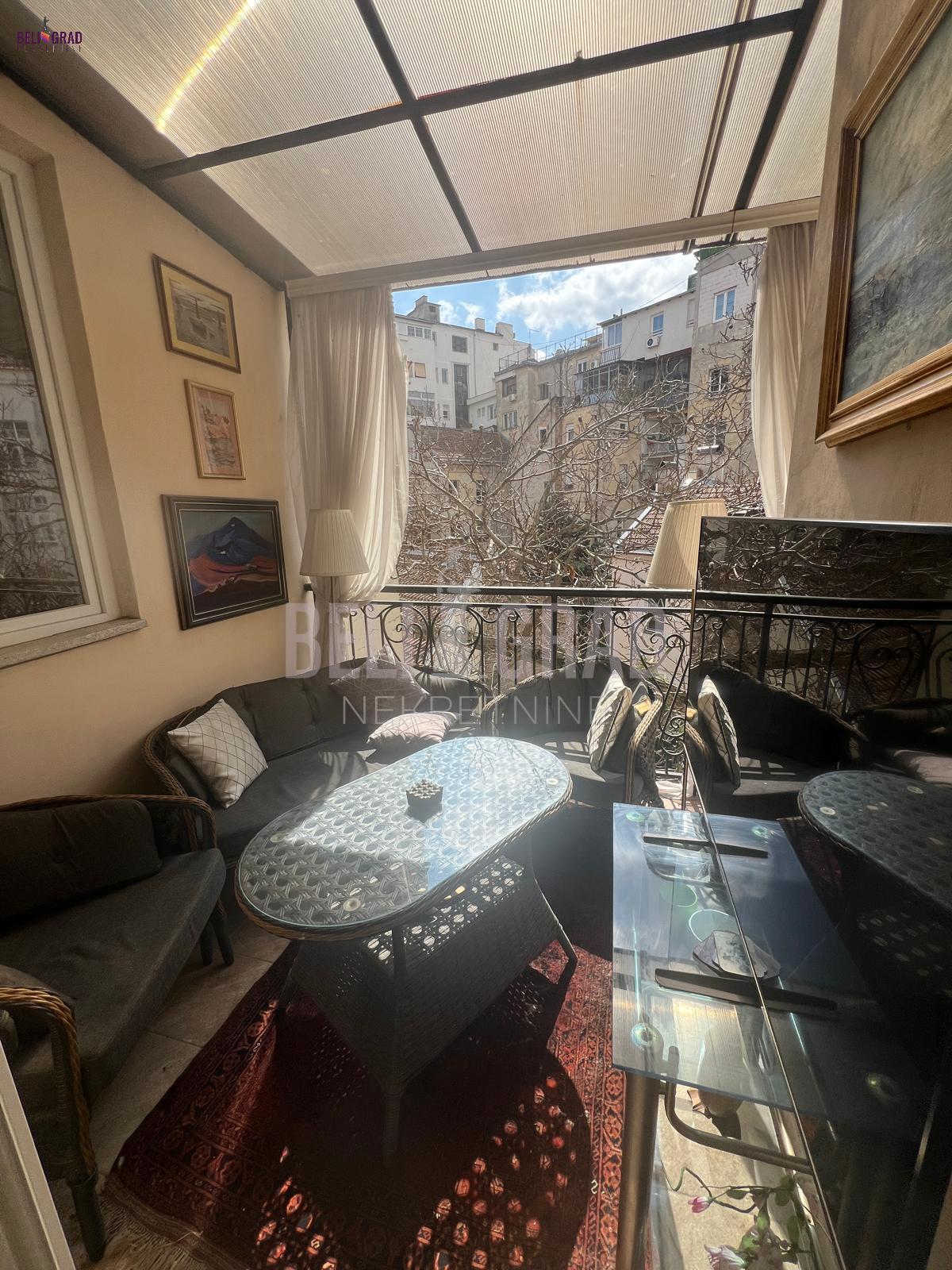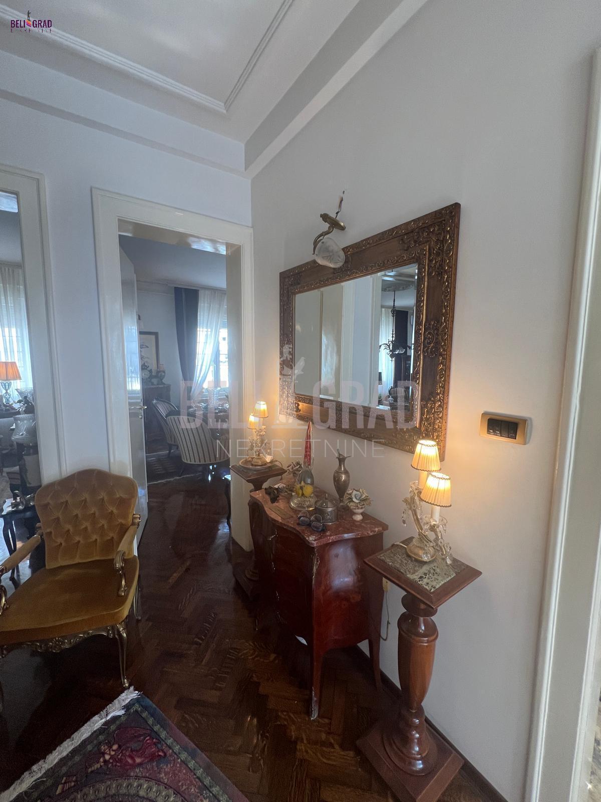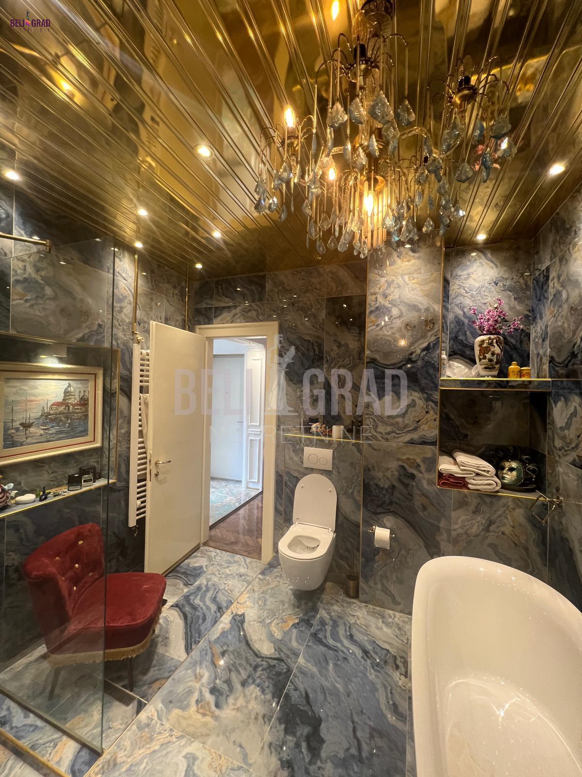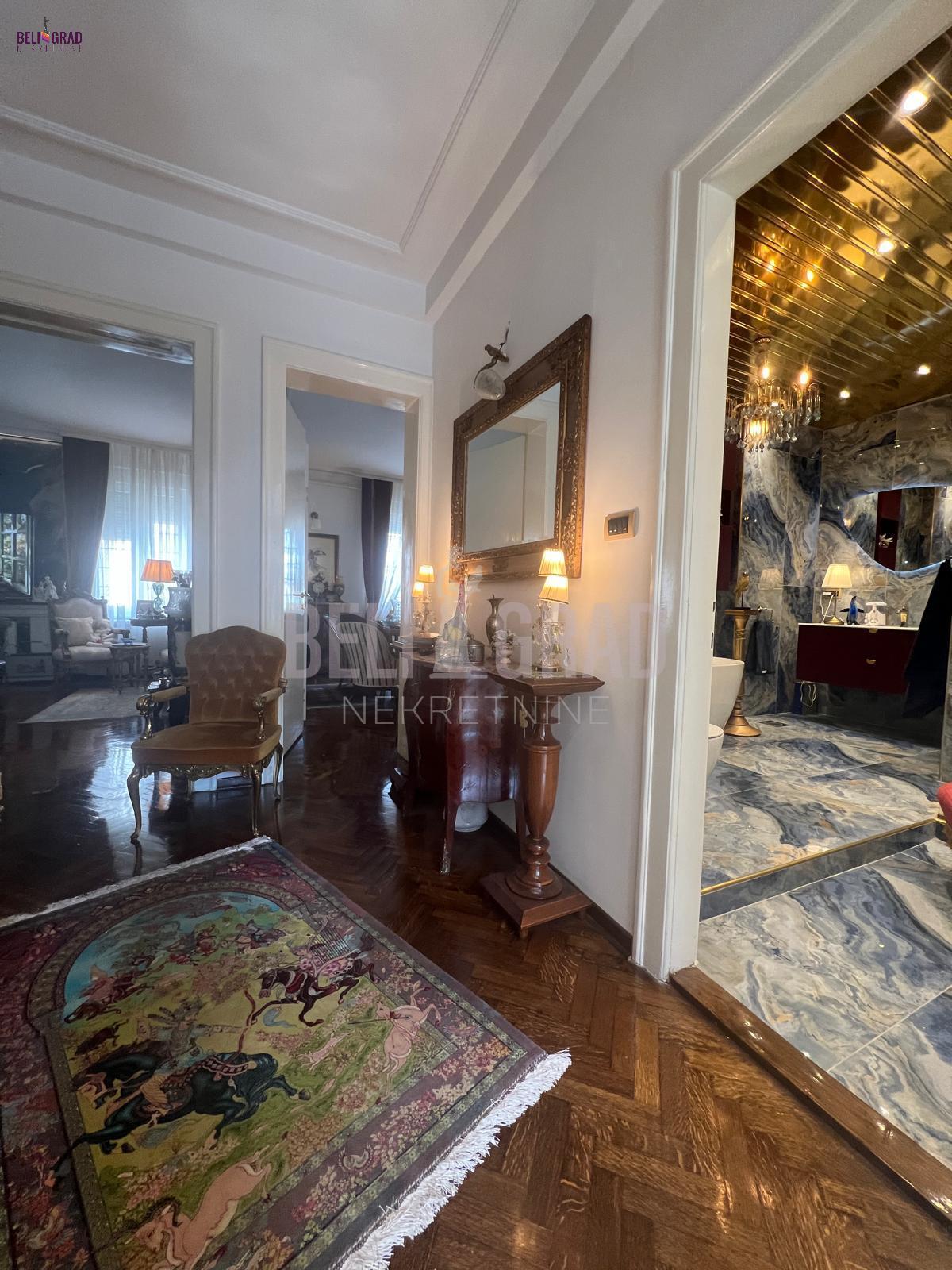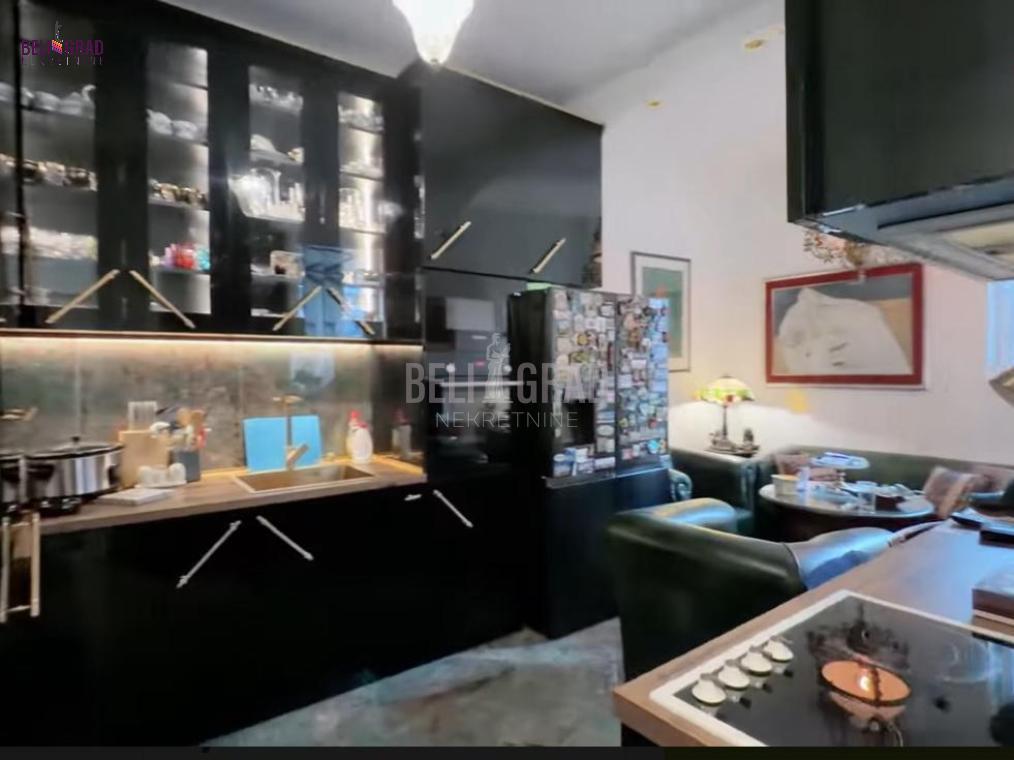 | Jedinstven ekskluzivan salonski stan povrsine 109m2 sa terasom, pozicioniran na odličnoj lokaciji u ulici Stanoja Glavaša, ispod Tašmajdana,u održavanoj predratnoj zgradi. U zgradu se ulazi kroz prelepo dvorište, a objekat poseduje i još jedno veliko dvorište iza zgrade koje je puno zelenila i rezervisano samo za stanare zgrade, sa izuzetno očuvanim i urednim širokim mermernim hodnikom. Stan čine tri prostrana salona – dva orijentisana ka ulici i jedan, prijemni-prolazni, ka dvorištu, što prostoru daje izuzetnu dubinu, prozračnost i eleganciju. Tu su i prostrana kuhinja i veliko, luksuzno kupatilo. Svaka prostorija ima svoj prozor i obilje prirodnog svetla. Stan poseduje i terasu od 6 kvadrata koja je okrenuta ka unutrasnjem dvoristu. Stan je kompletno renoviran, uz upotrebu najsavremenijih materijala i završnih radova vrhunskog kvaliteta. Enterijer je uređen u prefinjenom stilu “novi retro” ili savremeni klasicizam, u nekim detaljima i kao eklektični luksuz koji skladno kombinuje sofisticiranu klasiku i modernu estetiku. Podovi su obloženi mermernim pločicama Trussardi, kupatilo je opremljeno italijanskom keramikom i ovalnom samostojećom kadom, dok kristalni lusteri i autentičan nameštaj dodatno naglašavaju luksuz i karakter prostora. Iznad stana se nalazi betonska ploča i tavan visine oko 5 metara, koji se može adaptirati u stambeni ili poslovni prostor po želji budućeg vlasnika. Zgrada je izvorno građena kao privatna kuća, sa prednjim dvorištem i zadnjim dvorištem površine oko 2 ara, koje se koristi kao mirna zelena oaza za odmor — retkost u samom centru grada. Stanu pripada podrum, bezbedan, suv i sa osvetljenjem. Stan odiše toplinom, stilom i reprezentativnošću, idealan za one koji cene bezvremenski dizajn, vrhunski kvalitet i prestižnu lokaciju. Agencijska provizija 2% | |