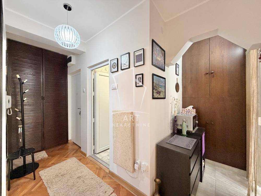 | Uknjižen stan 1/1, 49 m2, dvosoban, (49 m2 uknjižena kvadratura + terasa 6m2). Merena kvadratura je 55 m2. Interfon, internet, EG, klima, režijski troškovi minimalni - 30 evra. Stan je odmah useljiv. U najlepšem delu Karaburme, okružen zelenilom, kod stare okretnice, u održavanoj zgradi prodajemo dvosoban stan, pozicioniran u neposrednoj blizini Doma zdravlja, škole, vrtića, pošte, TC Big fashion, povezan sa centrom grada autobuskim linijama 16, 23, 25. Stan je potpuno renoviran, pvc stolarija. U stanu je pre tri godine rađena struja a krečenje, kupatilo i kuhinja pre godinu ipo dana. Prostorije u stanu: predsoblje, veće i manje, komforna velika soba, velika spavaća soba, zasebna kuhinja sa trpezarijom, kupatilo i velika terasa. Trenutno grejanje su mermerne ploče i klima. Iz hodnika se ulazi u svaku prostoriju posebno. Stan je svetao i sunčan, izolovan od buke, okružen zelenilom. Stan se prodaje delimično namešten: sa ugradnim plakarima u hodnicima i ugradnim plakarom duž celog zida u spavaćoj sobi, u velikoj sobi sa ugaonom garniturom i trpezarijskim stolom, kuhinjom rađenoj po meri sa šporetom i ležajem za sedenje i odmor. Lako može da se adaptira u 2.5 stan. Parking je u zoni slobodnog parkiranja. Stan je idealan za stanovanje i kao investicija, za svaku preporuku, retko u ponudi. Agencijska provizija 2% Agent: Vladimir Jovanović br. licence 1773 "Art nekretnine" d.o.o. Beograd. Reg. br. 339 011/26-20-734 . | |