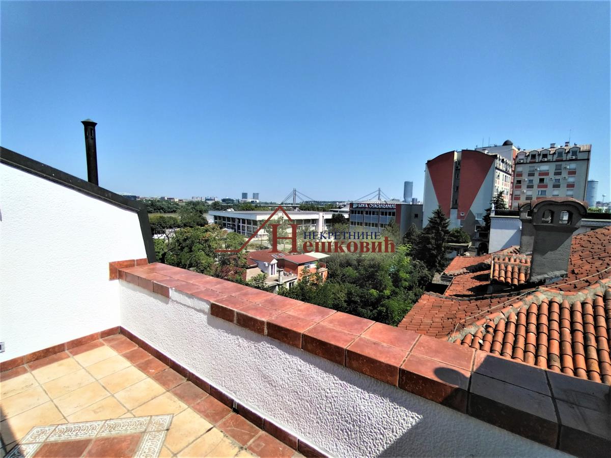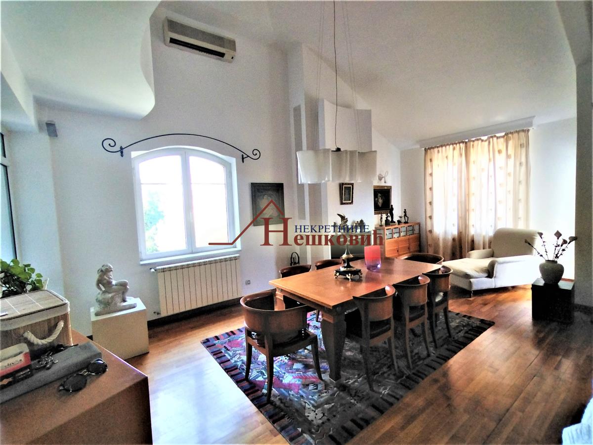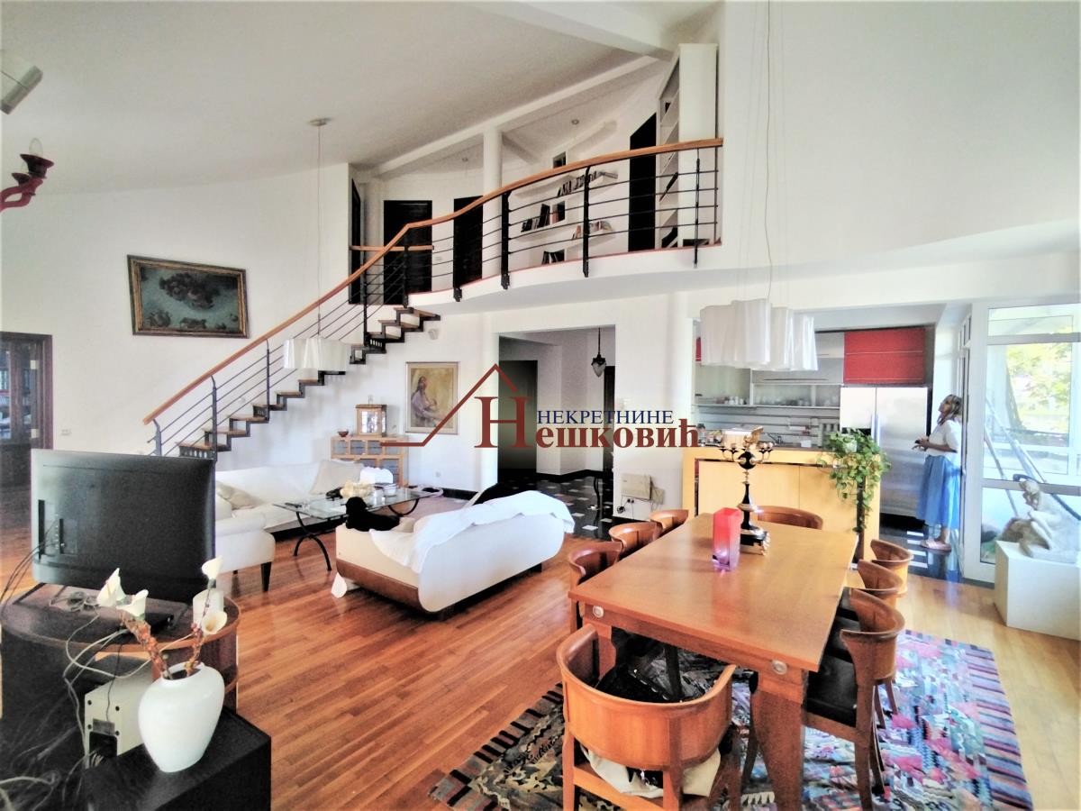 | Dvoetažni stan u odličnom stanju trostrano orjentisan trostrano orjentisan istok – jug – zapad Stan se nalazi na drugom spratu sa veoma laganim stepeništem Po strukturi četvorosoban plus radna soba, Donji nivo : veliki dnevni boravak sa visinom plafona od 3 metra do najviše tačke 4,5 metara koji je povezan sa kuhinjom i pored kuhinje je zatvorena lođa kao kuhinjska ostava , i vellika terasa od 10 kvm polukružna natkrivena, kupatilo prostrano sa prirodnom ventilacijom i samostalni toalet . Spavaća soba koja je povezana sa kupatilom i radnom sobom Polukružno stepenište koje vodi na gornji nivo: dve spavaće sobe, kupatilo, dva garderobera i sa terasom oko 10kvm koja je zapadne orjentacije Etažno grejanje na plin u celom stanu, Na podovima parket i keramičke pločice. Alu stolarija, u celom stanu, ima pripadajuću podrumsku prostoriju Miran i tih kraj sa veoma lepim pogledom prema mostu na adi i Novom Beogradu. Zgrada okružena zelenilom U neposrednoj blizini javni prevoz, prodavnica, Parking ispred zgrade nije zoniran Uknjižen bez tereta Kuhinjsi elementi bez bele tehnike uračunat u cenu a ostali Postojeći nameštaj po želji koji nije uračunat u cenu. Useljiv po isplati Agencijska nadoknada prema cenovniku agencije Razgledanje po najavi | |