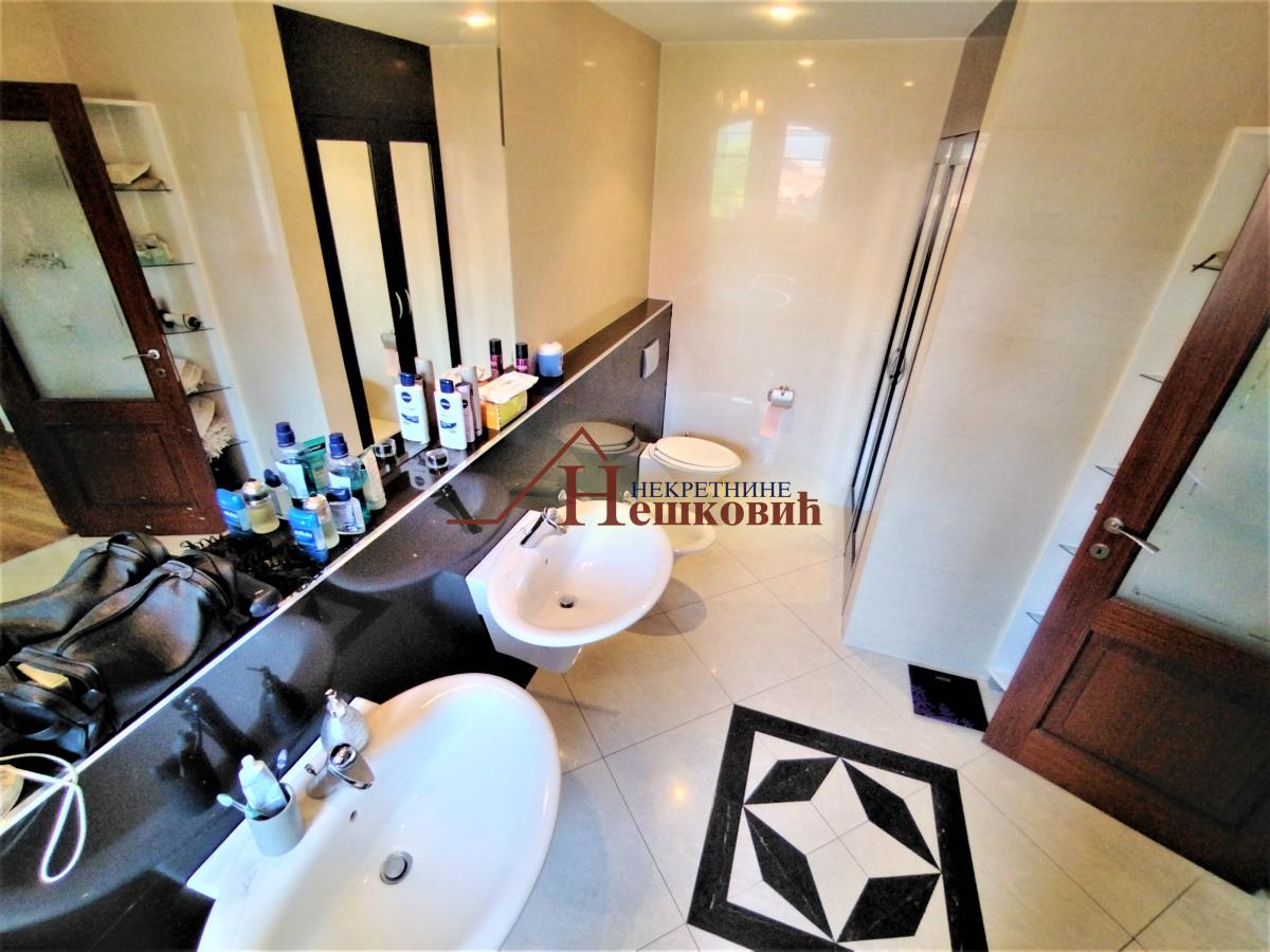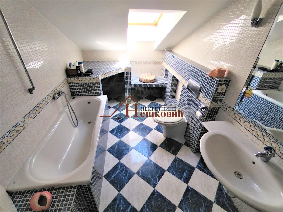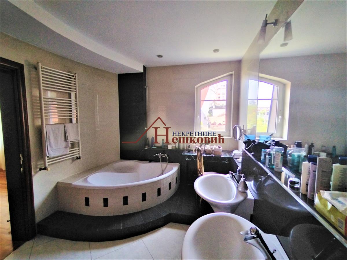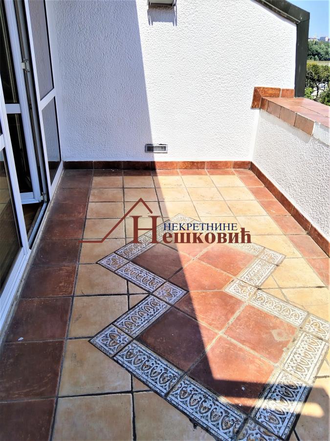 | Dvoetažni stan u odličnom stanju trostrano orjentisan trostrano orjentisan istok – jug – zapad Stan se nalazi na drugom spratu sa veoma laganim stepeništem Po strukturi četvorosoban plus radna soba, Donji nivo : veliki dnevni boravak sa visinom plafona od 3 metra do najviše tačke 4,5 metara koji je povezan sa kuhinjom i pored kuhinje je zatvorena lođa kao kuhinjska ostava , i vellika terasa od 10 kvm polukružna natkrivena, kupatilo prostrano sa prirodnom ventilacijom i samostalni toalet . Spavaća soba koja je povezana sa kupatilom i radnom sobom Polukružno stepenište koje vodi na gornji nivo: dve spavaće sobe, kupatilo, dva garderobera i sa terasom oko 10kvm koja je zapadne orjentacije Etažno grejanje na plin u celom stanu, Na podovima parket i keramičke pločice. Alu stolarija, u celom stanu, ima pripadajuću podrumsku prostoriju Miran i tih kraj sa veoma lepim pogledom prema mostu na adi i Novom Beogradu. Zgrada okružena zelenilom U neposrednoj blizini javni prevoz, prodavnica, Parking ispred zgrade nije zoniran Uknjižen bez tereta Kuhinjsi elementi bez bele tehnike uračunat u cenu a ostali Postojeći nameštaj po želji koji nije uračunat u cenu. Useljiv po isplati Agencijska nadoknada prema cenovniku agencije Razgledanje po najavi | |