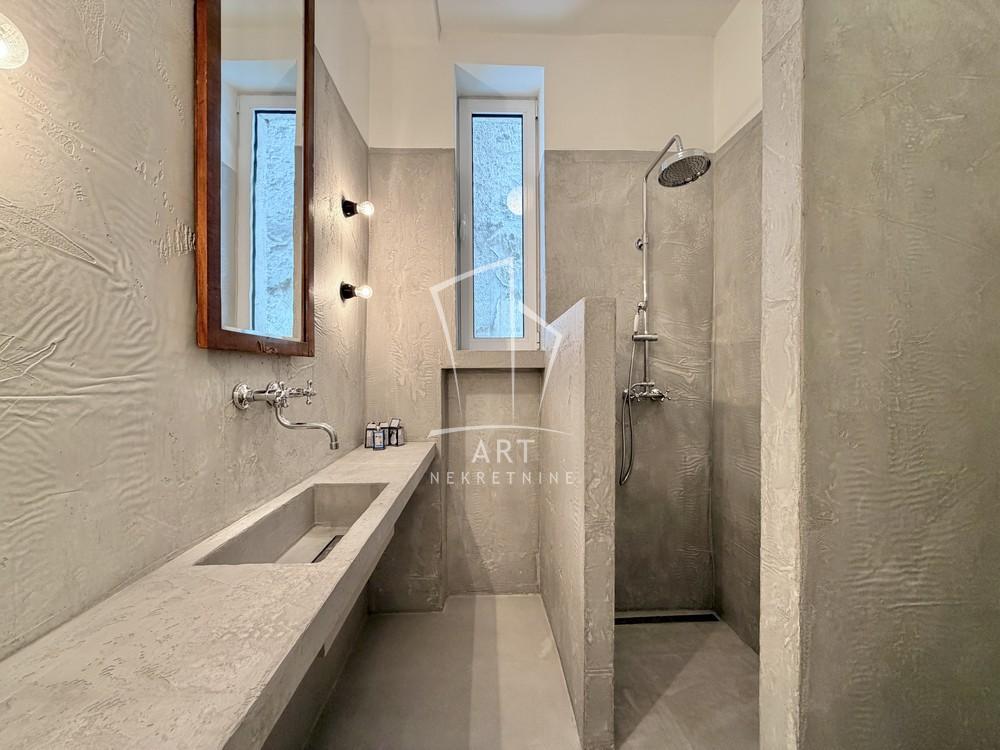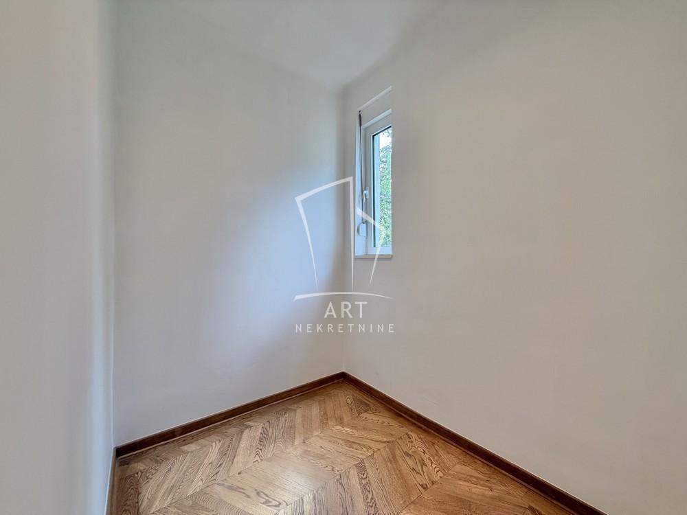 | Izdaje se potpuno renoviran salonski stan merene površine 95m2. Stan je dvostrano orijentisan, izuzetno svetao i prostran, sa visinom plafona od 3.20m. Po strukturi troiposoban sastoji se od velikog dnevnog boravka sa kuhinjom i trpezarijom, tri odvojene sobe, dva kupatila, hodnika, kao i terase i balkona. Sve prostorije imaju prirodnu ventilaciju. Kupatilo i kuhinjski sto su napravljeni od mikrocementa. U stanu su potpuno nove instalacije, unutrašnja i spoljašnja stolarija, kuhinja i u potpunosti renovirana kupatila. Grejanje i hlađenje je rešeno putem toplotne pumpe, uz podno grejanje i fan-coil sistem, što omogućava visok nivo komfora tokom cele godine. Stan poseduje sigurnosna vrata i interfon. Zahvaljujući rasporedu i atraktivnoj lokaciji, pogodan je kako za stanovanje, tako i za poslovni prostor (kancelarije, agencije, predstavništva i sl.). Agencijska provizija 50% vrednosti jedne mesečne zakupnine Agent: Jelena Momirov, broj licence 5463 "Art nekretnine" d.o.o. Beograd Reg. br.339 011/26-20-734 MJ06 . | |