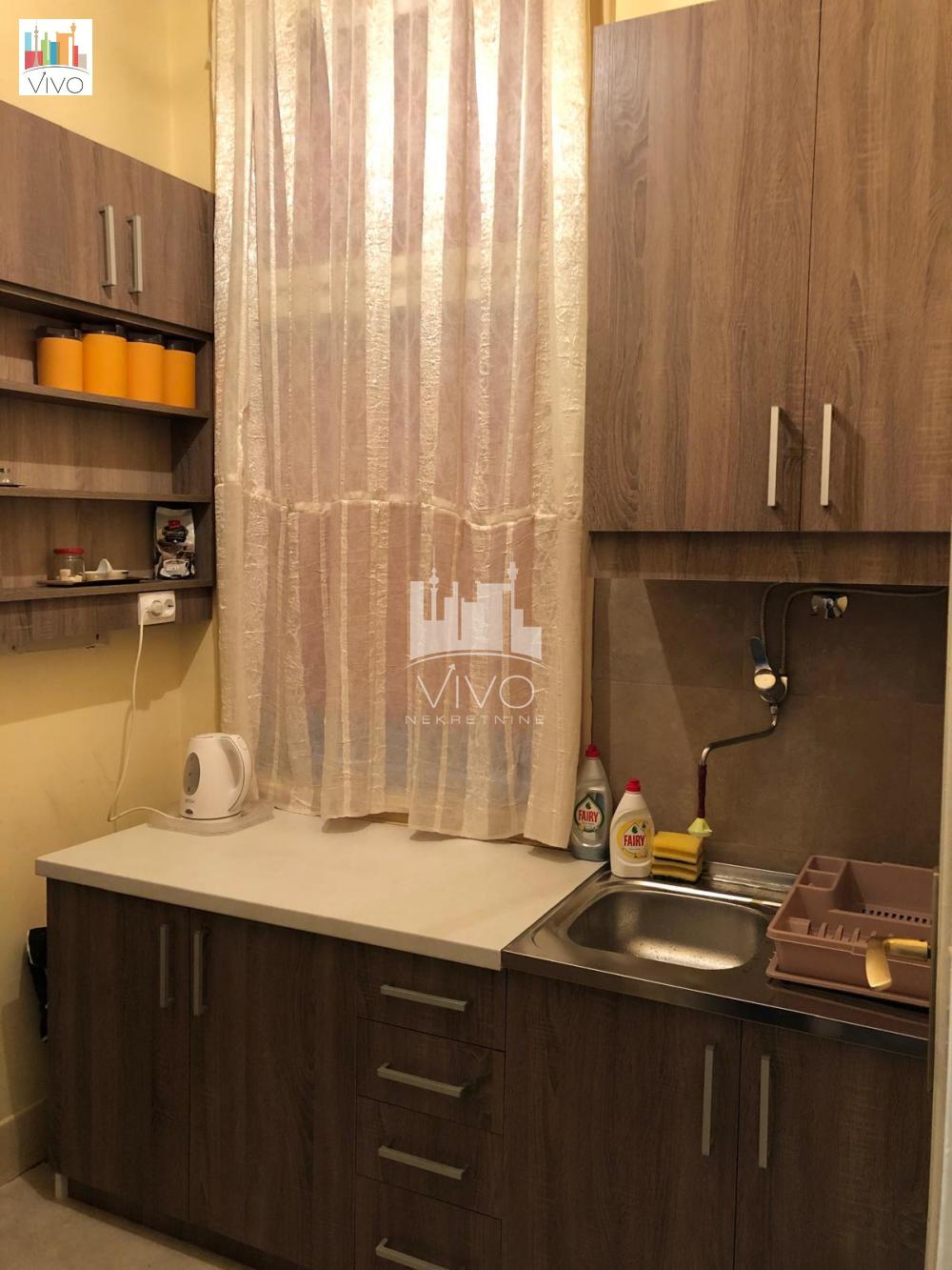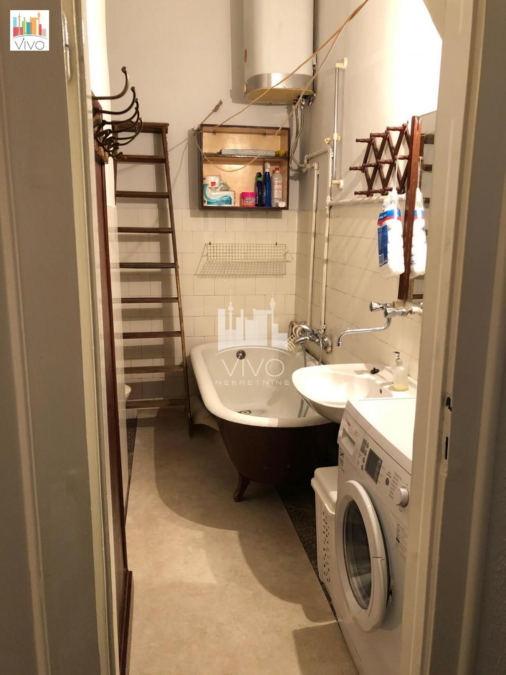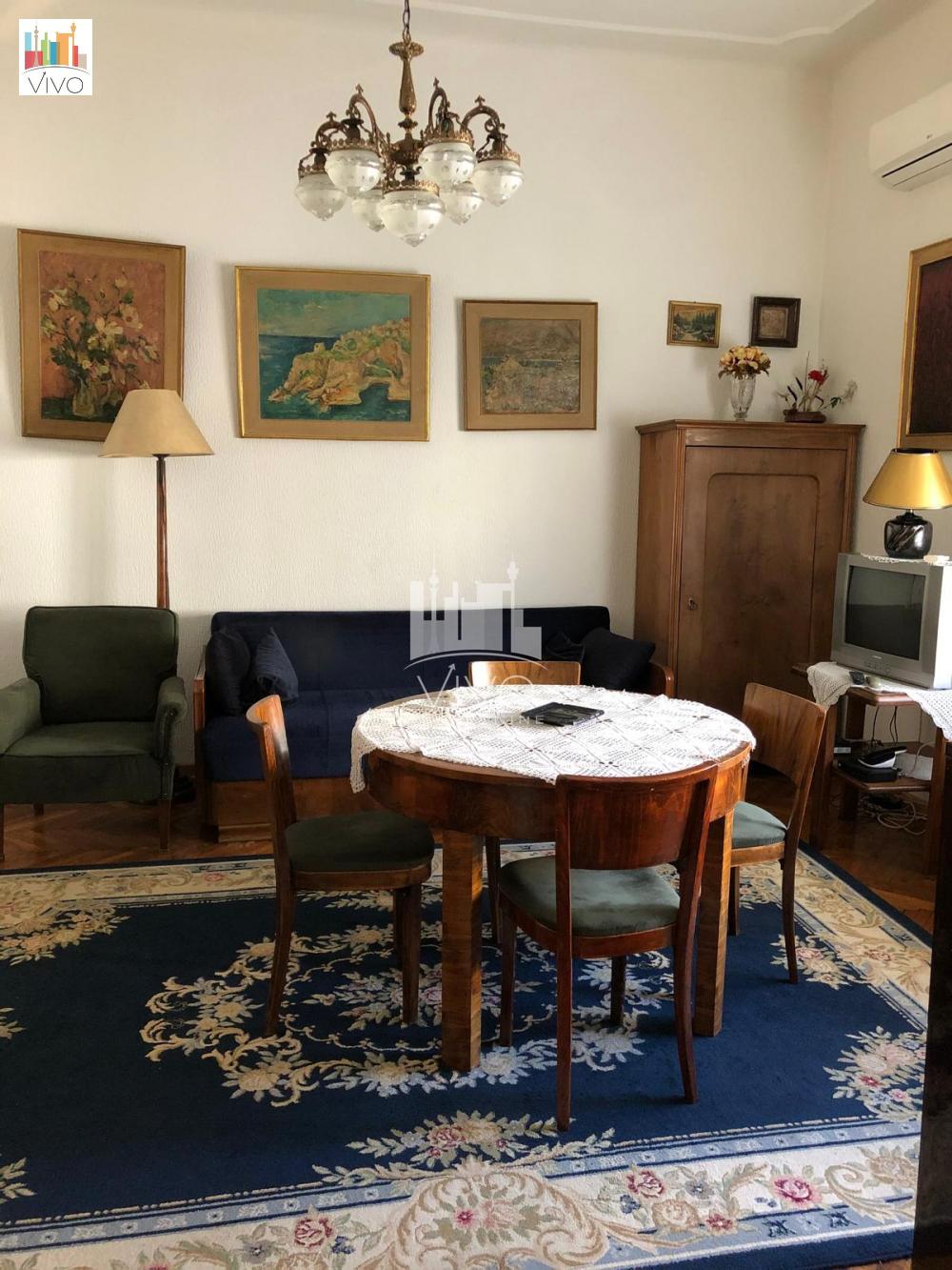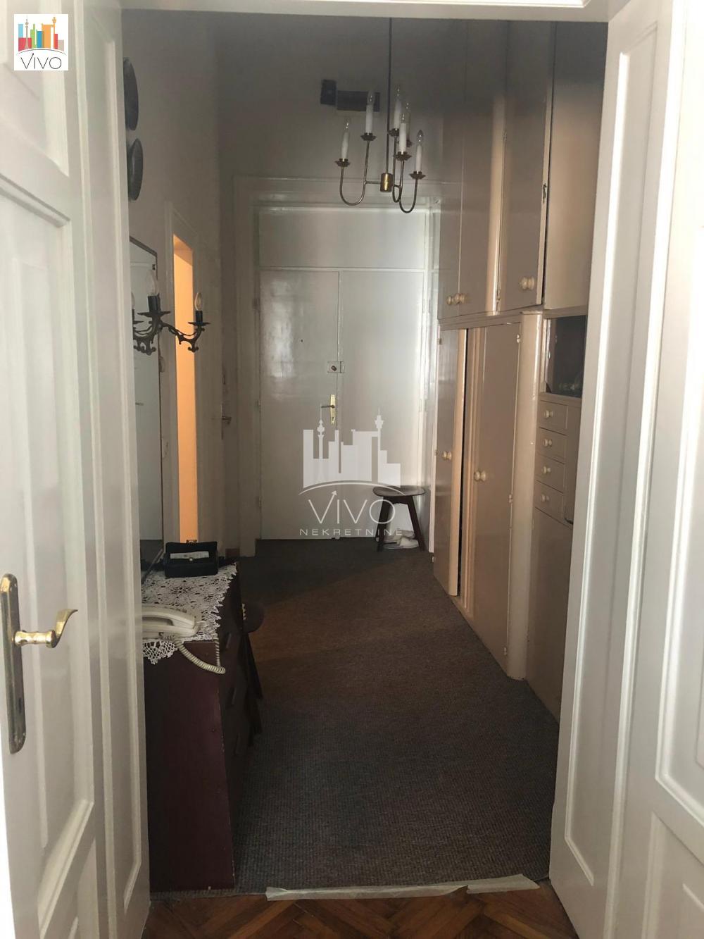U zgradi predratne gradnje sa urednim i održavanim ulazom dvosoban stan salonskog tipa, visina plafona 3,6m. Ulazno predsoblje sa mestom za plakare, kuhinja sa prirodnom ventilacijom, dnevna soba iz koje se ulazi u spavaću sobu, kupatilo sa prirodnom ventilacijom. TA grejanje, dve klime, interfon. Stan je uknjižen na ime prodavca. Agencijska provizija 2%