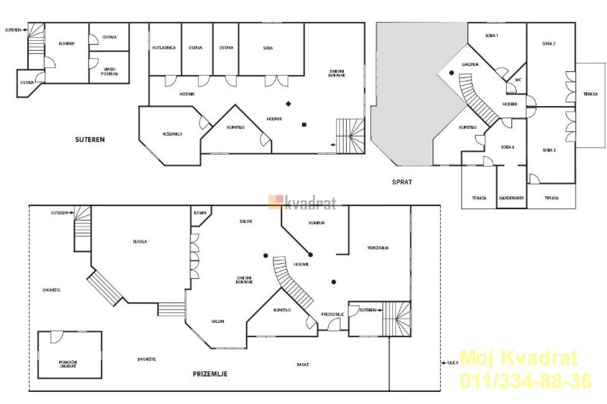 | Zemun - Pregrevica kuća, 765m2 (tri terase 76m2), Po+SUT+PR+I+Ptk, grafitno podno grejanje, telefon, interfon, podrum, šest parking mesta, četiri ostave, struja voda, kanalizacija, asfalt, plac 757m2, letnjikovac U ponudi luksuzna kuća u mirnoj ulici sa pogledom na Dunav, za udoban život. Kuća se sastoji iz više nivoa. PRIZEMLJE: raskošan dnevni boravak sa kaminom, dvostrano orijentisan i izlazi na terasu i predivno veliko dvorište, moderno opremljena kuhinja sa trpezarijom, kupatilo sa prirodnom ventilacijom. Bruto površina prizemlja iznosi 296m2, a neto 243m2. Iz prizemlja se silazi u suteren, koji se sastoji iz dva dela SUTEREN: I deo: višenamenske prostorije - dnevni boravak, hodnik, kupatilo, kotlarnica, soba, vešernica i tri ostave; II deo: ulaz u drugi deo je iz dvorišta - vinski podrum, kuhinja, ostava i toalet; SPRAT: hodnik, četiri sobe, master kupatilo i toalet; Prva soba je master spavaća soba (20m2) sa sopstvenim kupatilom (9m2) koje ima prirodnu ventilaciju, garderoberom (7m2) i izlazom na terasu površine 8m2; Druga soba (13m2) poseduje garderober sa prozorom (3m2); Treća soba (19m2) izlazi na terasu površine 9m2; Četvrta soba (14m2) izlazi na terasu površine 5m2; Kuća poseduje i prazan tavanski prostor (betonska ploča). Oko kuće je prelepo dvorište sa letnjikovcem i pomoćnim objektom (trpezarija, roštilj). Ulazno dvorište je sa nadstrešnicom i parking mestima za tri vozila, dok su ispred kuće još tri pripadajuća parking mesta. Za svaku preporuku! Vredi pogledati! Uknjižena na 765m2 građevinske površine. Agencijska provizija 2% Interfon, Telefon, Ostava Gradska kanalizacija | |