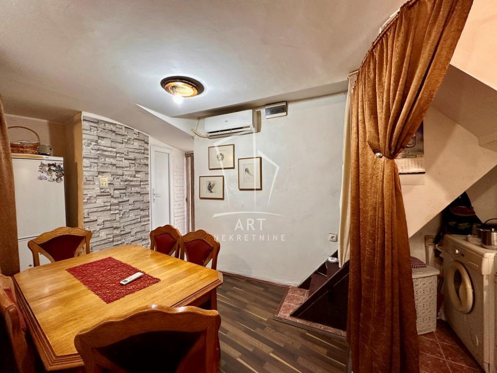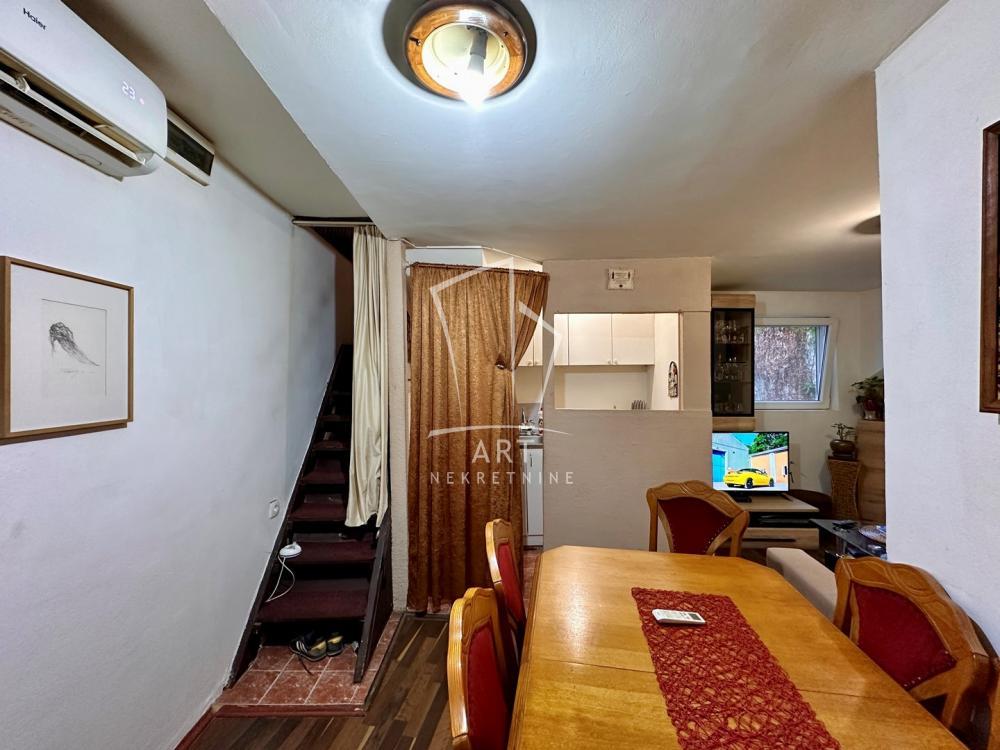 | Duplex u pristojnom zajedničkom dvorištu, sa nekoliko manjih kuća, na odličnoj lokaciji, zaseban ulaz iz dvorišta, u prizemlju su dve sobe (jedna nema prozor), kuhinja i kupatilo dok se na spratu nalaze dve sobe, pod kosinama ali sa bočnim prozorima. Odličan prostor za potrebe višečlane porodice ili kancelarijski prostor, možda i neka mirna delatnost za preduzetnike. Donji prostor može da se preuredi u veliki otvoreni prostor sa kuhinjom i trpezariom. Odlična investicija za budućnost. Uknjiženo kao stan u katastru bez upisane kvadrature, mereno ima 71m2. Stan ima prava korišćenja ostave u dvorištu. Agencijska provizija 2% Agent: Kristofer Šnajder, br. licence:1171 "Art nekretnine" d.o.o. Beograd Reg. br.339 011/262 07 34 . | |